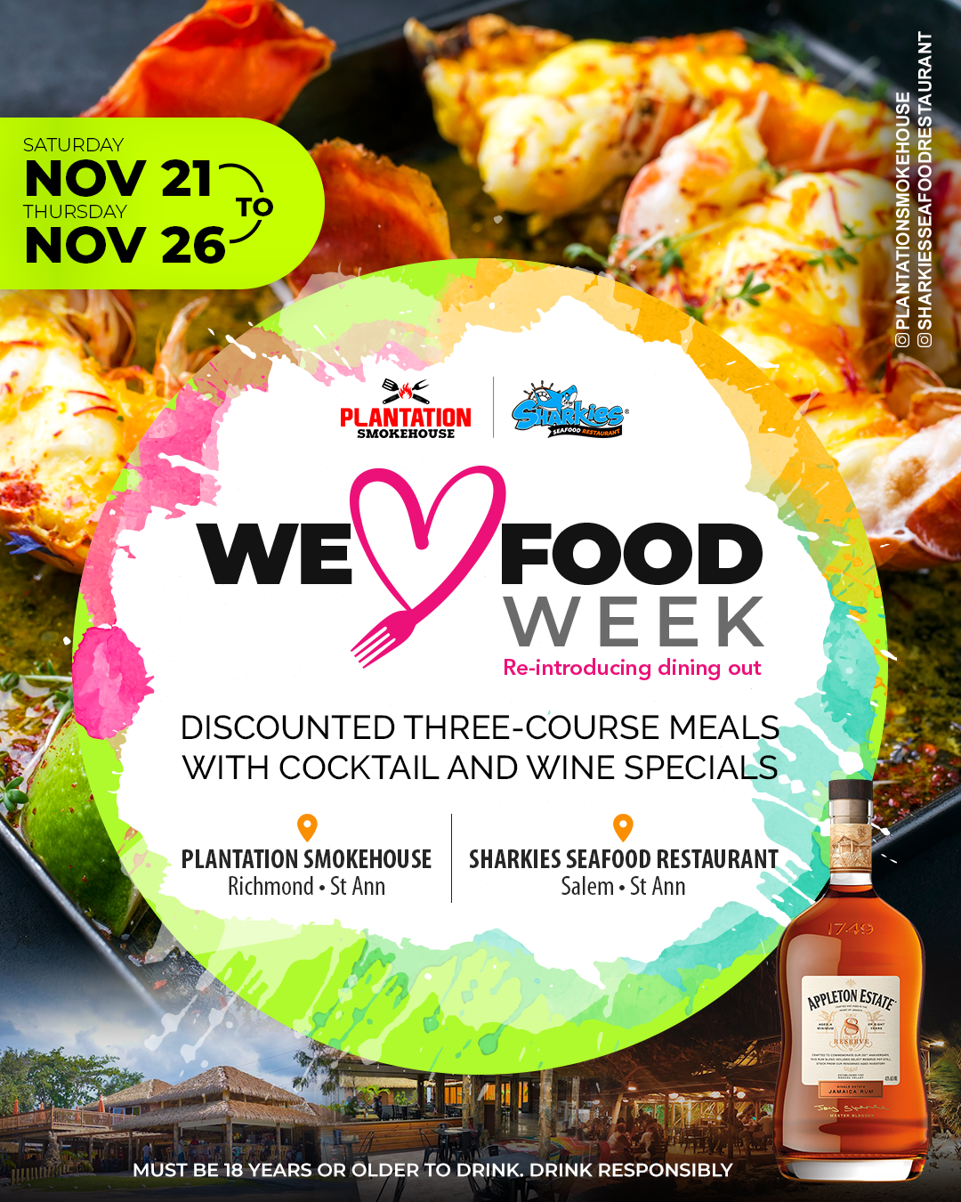 Two of Jamaica’s Top North Coast restaurants, Sharkies Seafood & Plantation Smokehouse, will host #WeLoveFood week from November 21-26 as it seeks to re-introduce the dining out experience.